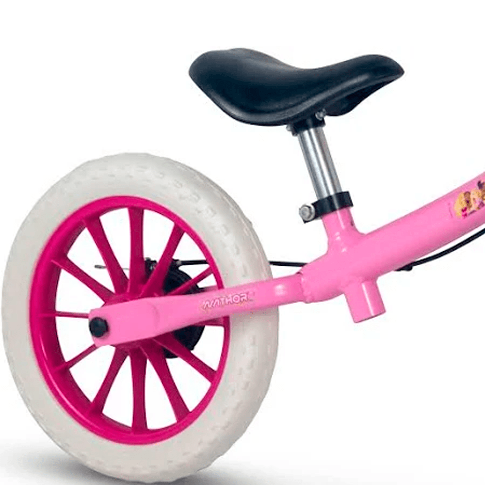 A bicicleta Balance Nathor conta com limitador de giro do guidão (garantindo mais segurança), pneus em E.V.A. (mais leves e antiderrapantes), freio traseiro a tambor e regulagem de altura do selim de PU.